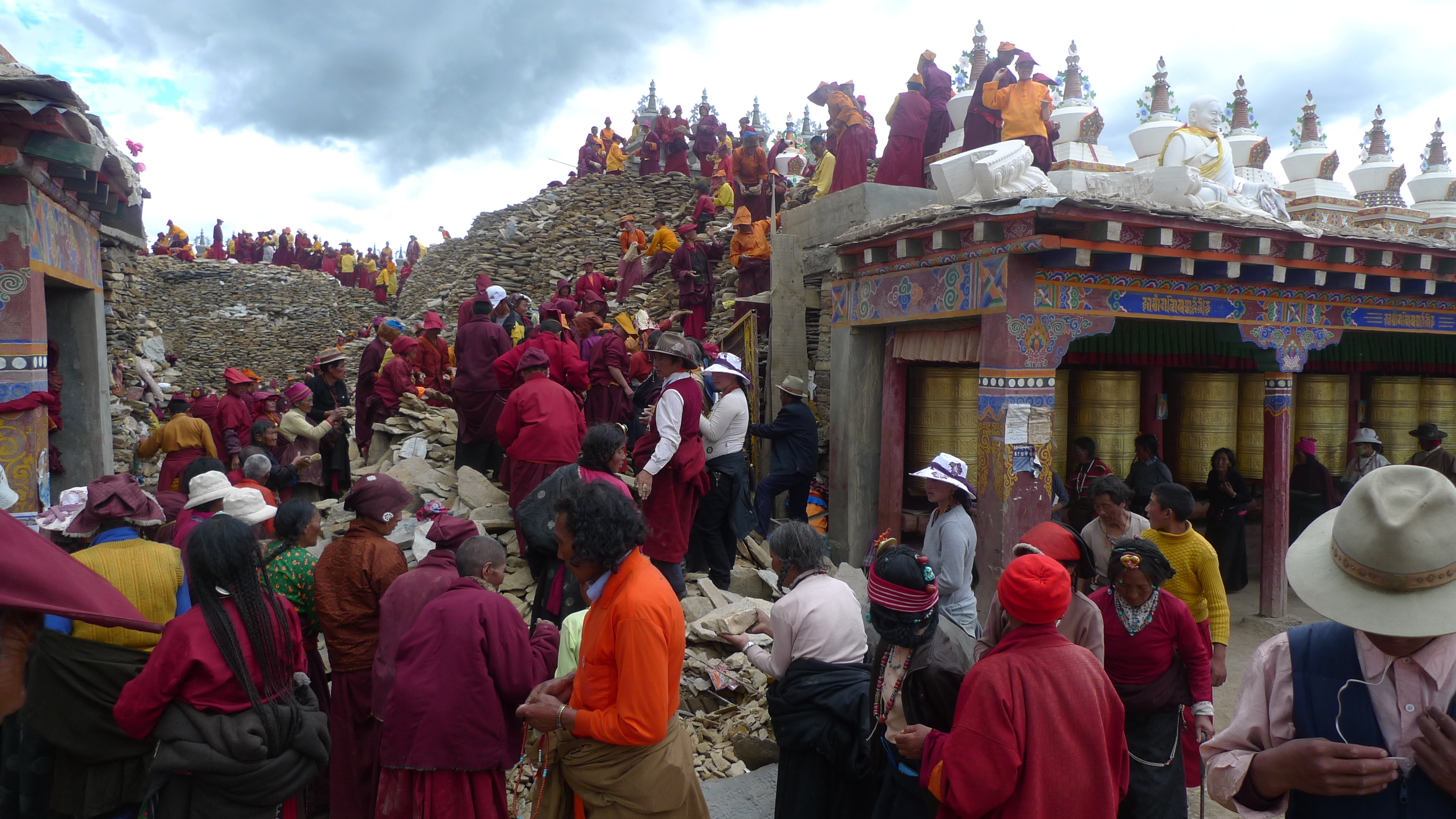 This contrasts with Katok Monastery, which typifies the ‘concrete’ construction style. At Katok, there were no less than three major construction projects going on simultaneously. Each of these buildings required large numbers of dump trucks, concrete mixers and workers. While I’m sure that the results will be impressive, the current situation can only be described as chaotic and dirty. In his Footprint Tibet guidebook, Gyurme Dorje extols the serenity of Katok monastery, saying, “Anyone viewing the majestic setting of Katok’s red and white buildings which cover the peaceful mountain top can appreciate why the concept of ‘sacred outlook’ or ‘pure visionary perception of the landscape’ is so significant here.”[1]