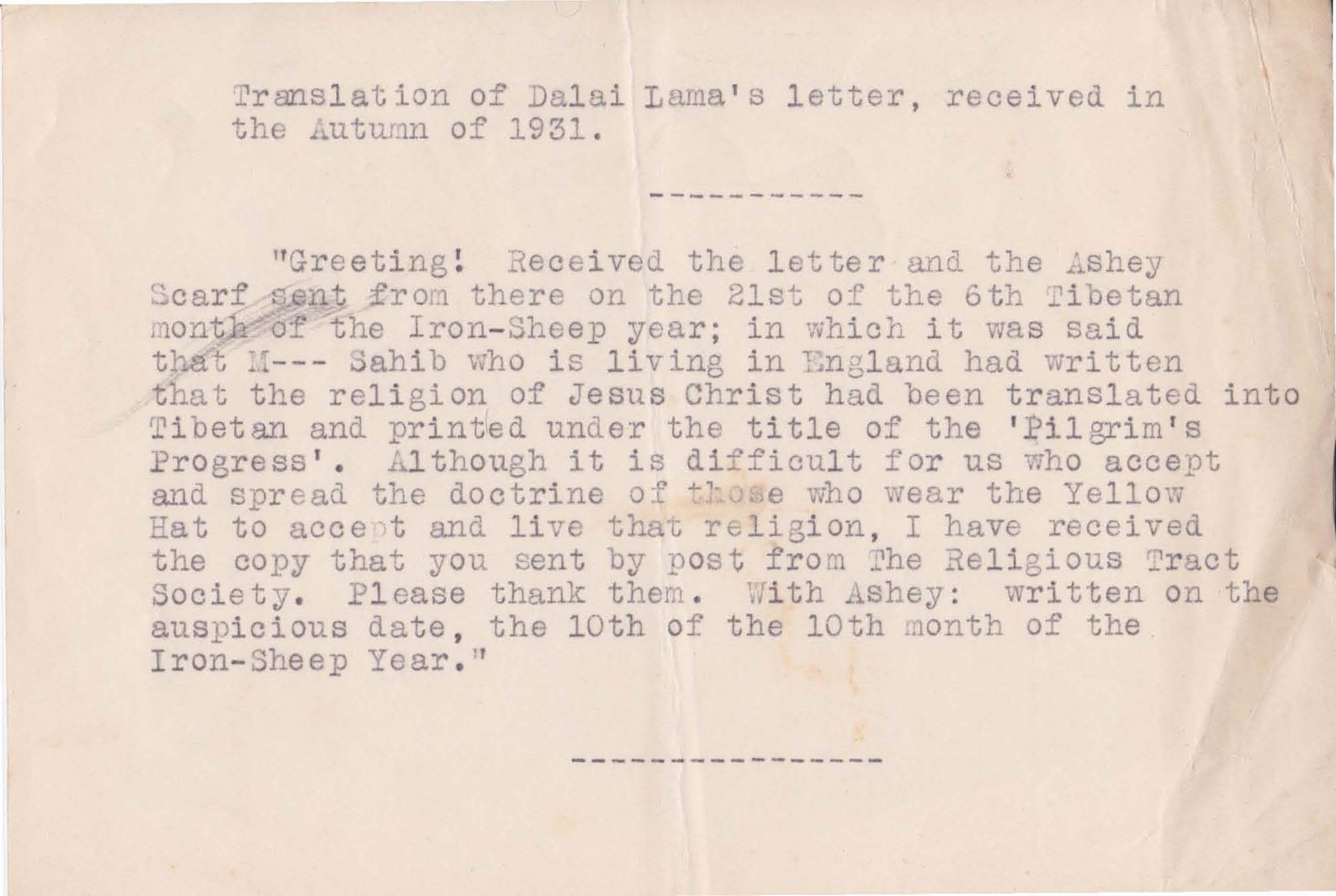 Figure 3: A Typescript translation of a letter from the Thirteenth Dalai Lama. My copy of this text included two such letters, with identical text, but, alas, not the original letter in Tibetan.