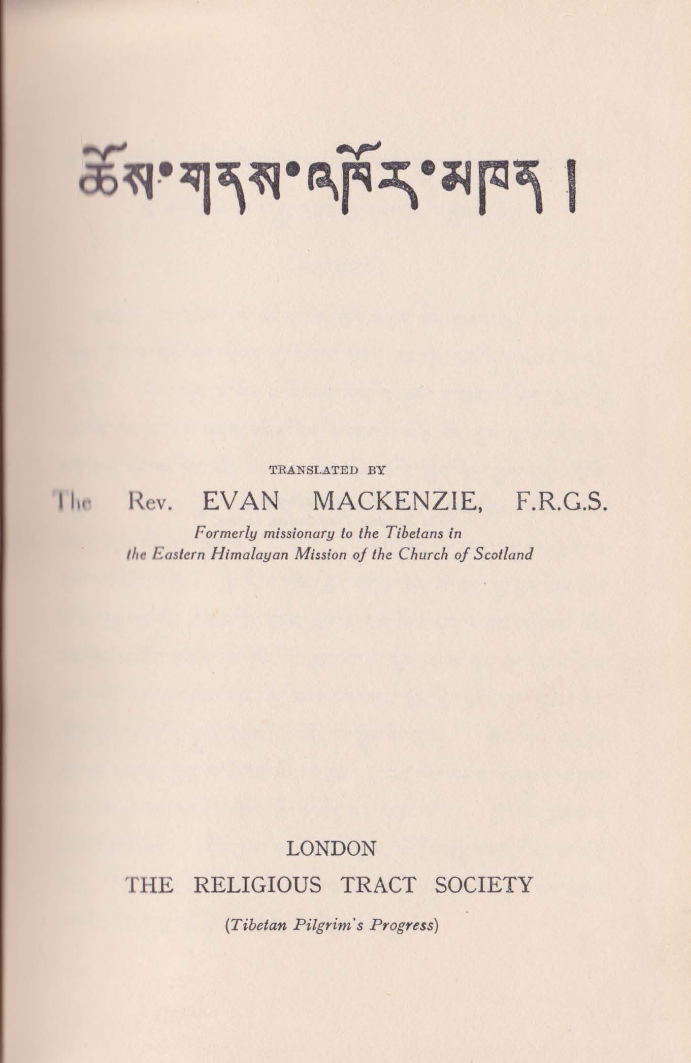 Most of us who think about Tibetan history are aware of the longstanding activities of missionaries in that country. From António de Andrade‘s mission in the early seventeenth century through today, missionaries have long sought a foothold in Tibet. And sometimes they leave a relic behind to remind us of their dedicated and industrious efforts to spread the gospel. Case in point: my new copy of John Bunyan’s Pilgrim’s Progress translated into Tibetan by by the Revered Evan Mackenzie, F.R.G.S. and published in London by the Religious Text Society, sometime before 1931 (more on the dating of the text later). Translating from Tibetan is a difficult task, but translating into Tibetan is something else again, and the Rev. Mackenzie deserves credit for this difficult work. I also can’t help but feel that Bunyan’s epic allegory is an interesting choice for translation in this context. Offhand, I can’t think of any Tibetan works that rely on the same type of extended allegory (I’m sure my ignorance will soon be corrected by an alert reader out there somewhere). At the same time, some of the images, such as a man burdened by his past, or the idea of treading a religious path, resonate with Tibetan religious notions, so perhaps it is a good selection.